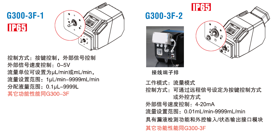 蘭格公司根據(jù)客戶的具體需求,提供定制化的工業(yè)蠕動(dòng)泵解決方案。G300-3F-1和G300-3F-2都是以G300-3F為基礎(chǔ)的定制化產(chǎn)品,可以配合使用市場上常用的工業(yè)蠕動(dòng)泵泵頭,并根據(jù)需要更改工作模式、外控功能、增加泵頭漏液檢測功能等。