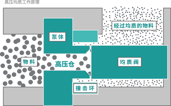 物料由物料杯經(jīng)單向閥進(jìn)入高壓倉(cāng),通過泵體伸縮加壓使樣品達(dá)到所調(diào)節(jié)控制的高壓下,通過特定寬度的限流縫隙瞬間釋放形成微射流撞擊沖擊閥或均質(zhì)閥上,依次經(jīng)過空穴、撞擊、剪切的作用來達(dá)到物料的乳化分散和細(xì)胞粉碎機(jī)的目的。