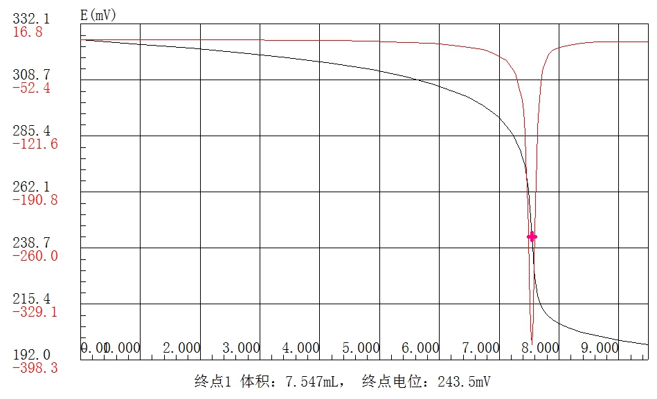 測試過程:稱取10g試樣,精密稱定,置于滴定杯中,加50mL水溶解后,加2mL磷酸溶液、5mL碘化鉀溶液。充分混勻,用硫代硫酸鈉標準滴定溶液(0.002mol/L)在自動滴定儀上滴定至終點。