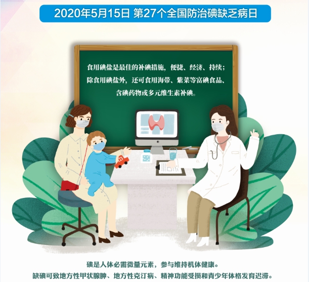 2020年5月15日是我國第27個“防治碘缺乏病日” ,主題是“眾志成城戰(zhàn)疫情,科學補碘保健康”。旨在通過普及碘缺乏病防治相關知識,使公眾在防控新冠肺炎疫情的同時做好科學補碘工作,進一步增強全社會對食鹽加碘防治碘缺乏病工作的認同和支持。